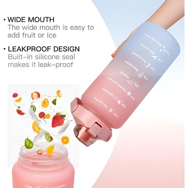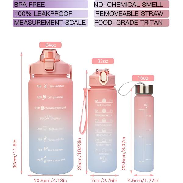 Táto sada obsahuje tri fľaše na vodu v gradientných farbách, z ktorých každá má na prednej strane motivačný citát a na zadnej strane sú uvedené hodnoty objemu.